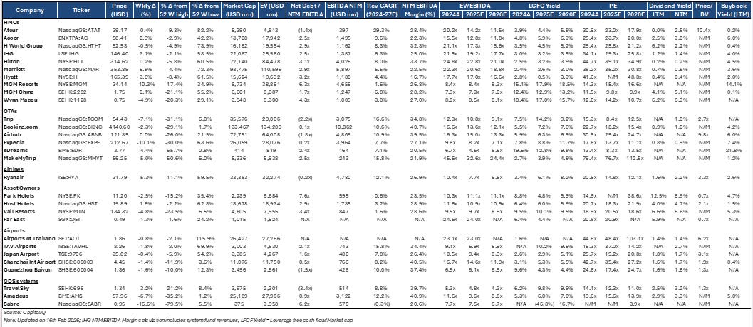 Stock Price Movement: Last week, the three major indices all posted weekly losses with the Dow Jones Industrial Average fell about –1.2%, the S&P 500 slid roughly –1.4%, and the Nasdaq Composite dropped around –2.1%, driven by ongoing concerns about technology-sector weakness and AI-related disruption despite some positive inflation data late in the week. The coverage universe moved from -16.6% to +6.8%. Sabre down 16.6%